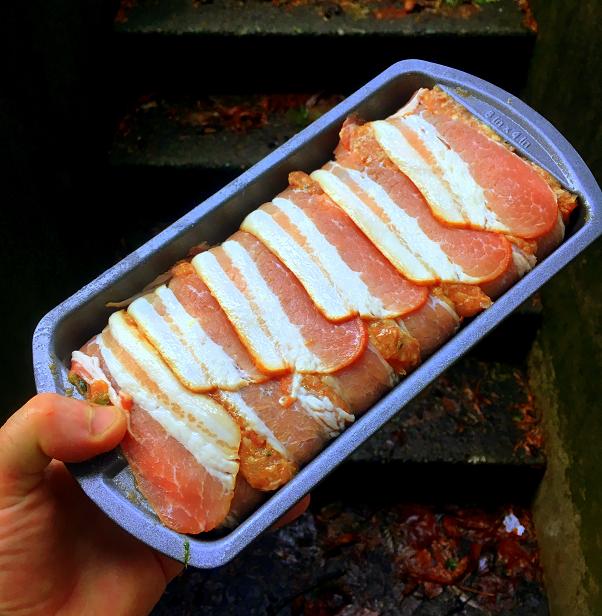- Line a 1 ½ quart (1 ½ L) loaf pan with overlapping pieces of bacon, leaving enough to overhang the edges by about two inches. Pour in the meat mixture and pack it down to remove any air pockets hiding deep in the mix. Wrap the overhanging bacon over top of the meat and cover with foil. Leave the loaf pan out on the counter for twenty minutes to let the whole shebang settle.