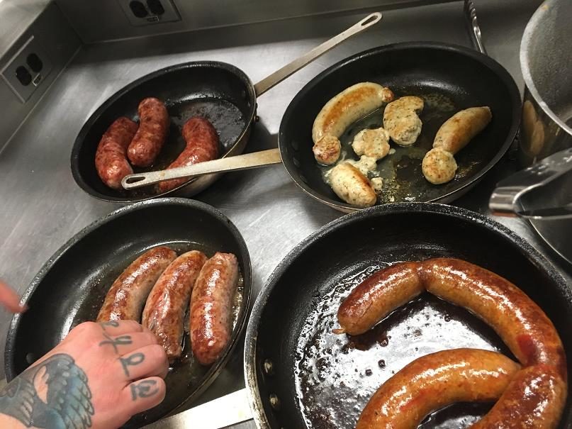 Chef-turned-farmer Brian McCormick from Clever Crow Farms out in Black Creek brought in a hand crank sausage stuffer and everyone took a turn feeding the hopper and guiding long tubes of ground meat into casings and then twirling them to create sausage links. This last step took a bit of finesse, but after a couple of tries under the guidance of the maestro even I got the hang of it.