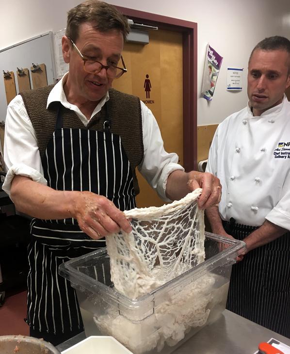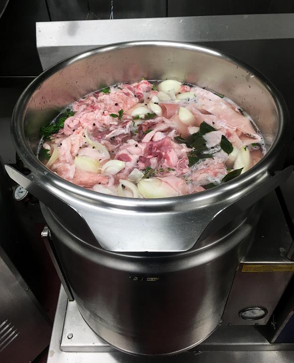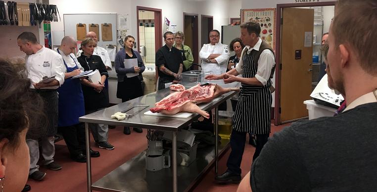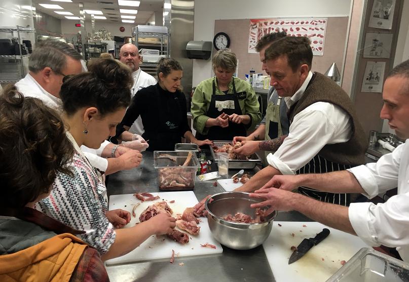 We were in the spacious commercial kitchen of North Island College’s Culinary Arts department for the NVICA Charcuterie Workshop; a two-day journey through the world of salting, curing, pressing and preserving meats. There were twenty or so of us foodservice pros gathered around John as he guided us from whole hog (literally!) to finished product and every critical step in between.