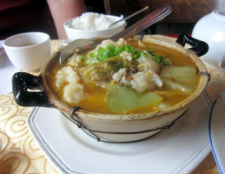 Flounder is lightly seasoned and simmered in a Chinese earthenware pot with a hot and savoury broth flavoured with chillies, Sichuan peppercorns and fermented cabbage. The cabbage imparts a subtle sourness that’s really unique and delicious with the fish. The texture of the flounder is like nothing I’ve ever had. Soft, slightly gelatinous, unctuous (been waiting to use that word for a while!) and so velvety that it almost falls apart when lifted from the pot. Once in the mouth, it melts like butter.