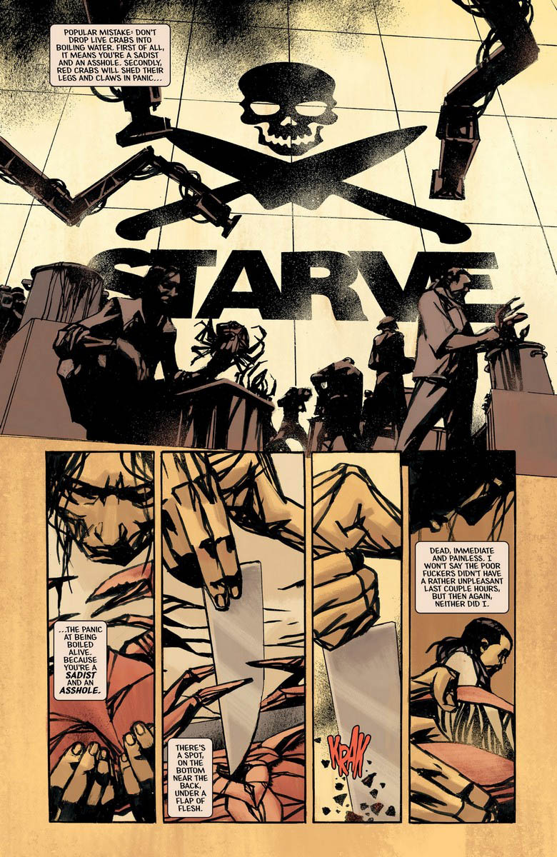 It’s got a solid foundation; Starve Volume 1 was a tour de force of both art and storytelling. Set in the very near future when global warming/overpopulation has led to a nearly-total world sprawl. Perversely, despite world-wide starvation a very elitist type of entertainment pits celebrity chefs against one another using endangered ingredients for a panel of über-entitled judges. Not too far off from now eh?