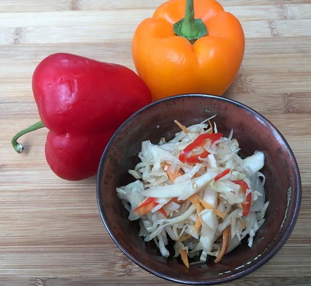 - Combine the sliced cabbage, carrot, onion and chillies in a large non-reactive bowl and sprinkle in the salt. Mix well and let it sit at room temperature for about half an hour. The mix is ready to pickle once the cabbage is softened.