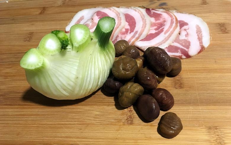 - Drop the butter in and wait for it to melt and fizzle before adding the onion, fennel and garlic. Stir them around and cook until translucent, approx 5 minutes. Pour in the water/stock, add the chestnuts and bring to a simmer. Slap on a lid and cook for ten minutes.