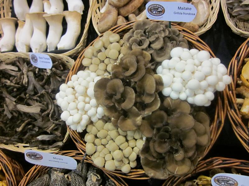 The foraging team from Ponderosa Mushrooms in Port Coquitlam had set up a feast for the eye (and nose!) at their booth. Locally foraged and cultivated mushrooms and berries literally sprang out of their baskets towards us. “What’s this? What’s that? I didn’t know that grew here!” What an incredible assortment of fungi (Everything from porcini, shimeji, morel and king oyster to weirder ones like lobster, lion’s mane and the visually dazzling blue stem mushroom) and locally picked berries (wild blueberries, currants and lingonberries). This is the kind of spread that really gets a foraging freak like me excited!