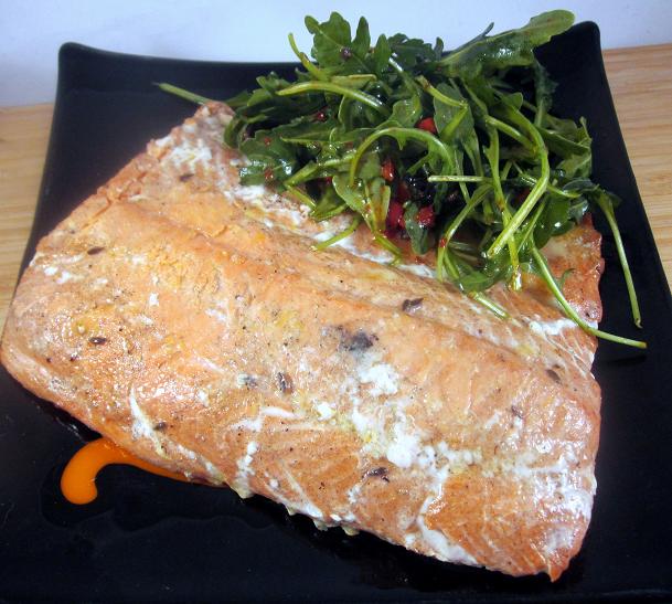 - Carefully remove the salmon to your serving plate with a spatula and serve with a little salad of arugula, red pepper and fennel fronds tossed in some oil, honey, white wine vinegar and the juices of the remaining orange and lemon halves. So nice!