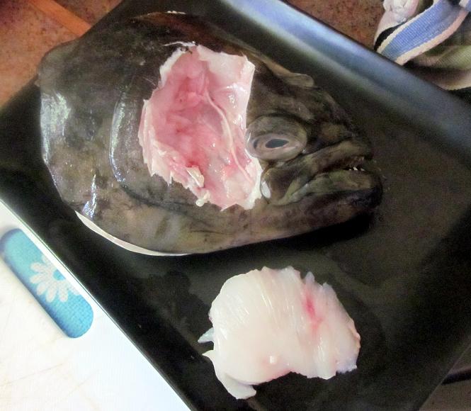 Next are the cheeks! Often cited as the best bits of meat on the whole fish, these two über-tender nubs can be carved out by digging your knife in just behind the eye (the one that looks like it’s in the right place) and run the tip along the jaw bone down to where it meets the edge of the gill plate. Scrape your knife up and around the whole of the plate then back to the eye.