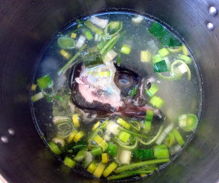 Wrap and refrigerate the meat for later and gather up the pieces of the mantle, the head, fins and any other stray bones. It’s time to brew some quality fish broth.