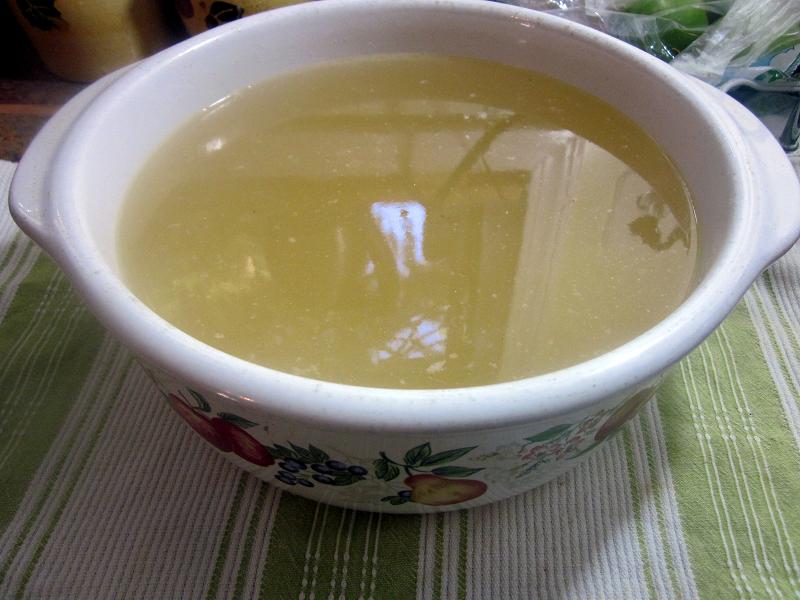 The Kraken Rises! - Set up a ladle and a small bowl filled with cold water beside your stockpot. Use the ladle to skim off the protein scum that rises to the surface of your stock, and deposit it into the bowl. The water absorbs the scum and cleanses the ladle. Repeat this process whenever more whitish-grey scum appears on the surface of the stock.