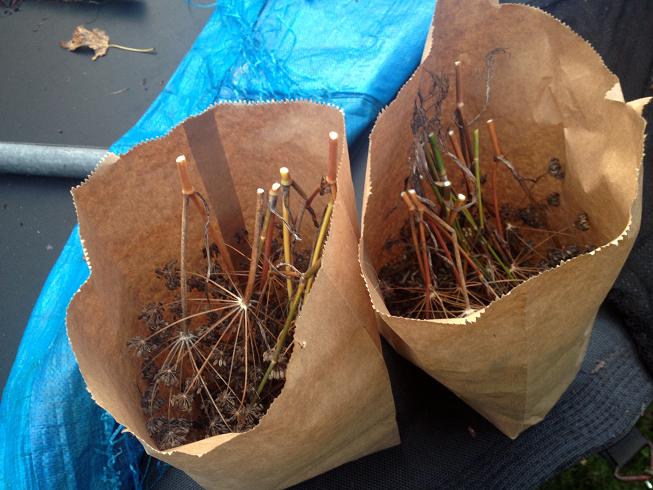 The stems are hollow and very easy to clip off with a sharp knife or pair of scissors. Cut an inch below the flowers and toss the whole thing into a large paper bag. Fill the paper bag up about half way and then open up another one. We want the flowers to dry loosely-packed to avoid damage and moulding.