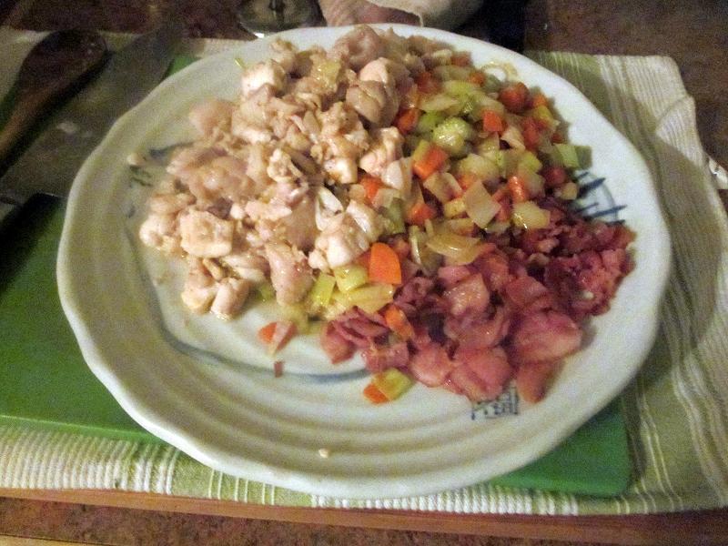 - Increase the heat to medium and melt the butter in the bacon fat (that’s officially the sexiest thing I’ve ever written!). Season the halibut trimmings with a bit of salt and white pepper and sauté them in the pot for 2 minutes. Transfer the trimmings from the pot to the plate and add the leeks, celery and carrots. Cook them for 4 minutes, stirring occasionally and once again transfer to your plate.