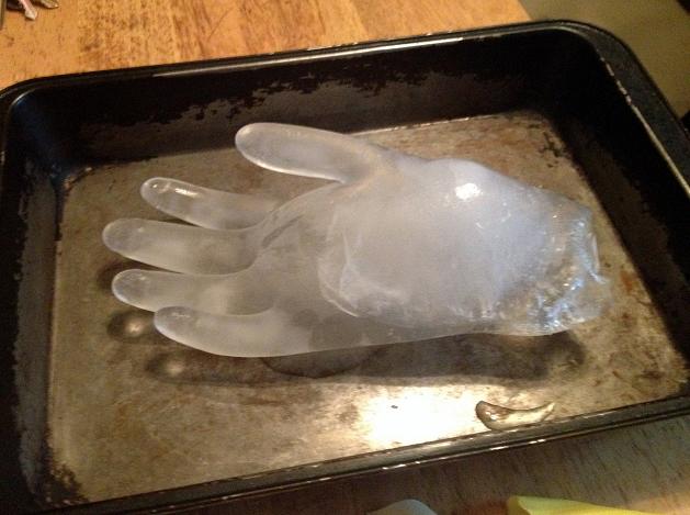 - Carefully cut the latex glove off of the ice hand, making sure to be extra gentle around the fingers. Wash the hand in cold running water for a couple seconds to get rid of any latex bits or texture left over from the interior of the glove.