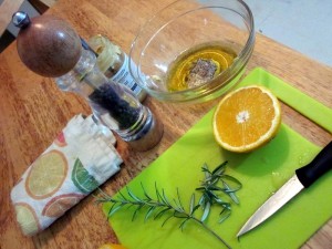 2. Mix the oil, mustard, spices, the juice from one of the oranges, and 1 ½ tbls. of the fresh rosemary (chopped). Save the Rosemary stalks, we’ll be using those later. Whisk ingredients together in a small bowl until they’re well mixed and have the texture of a salad dressing. Rub half of this mixture all over the ham, making sure to get it in all those little checkerboard valleys. Place the ham into an oiled roasting pan and fire it into the oven for 1 ½ hours.