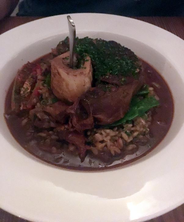 Crystal was in a red meat mood and ordered the Osso Bucco without a second thought. It arrived exactly the way you would expect from a farmhouse kitchen in Lombardi; A big shank front and centre with a spoon sticking out of the marrow, grilled veggies, gremolata, the works! The meat just melted away at the slightest touch of a fork and the sauce had all the richness of the bone without any greasiness.