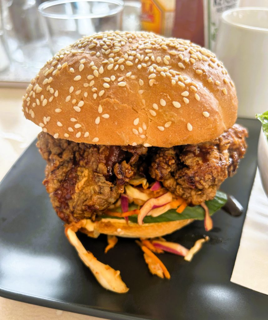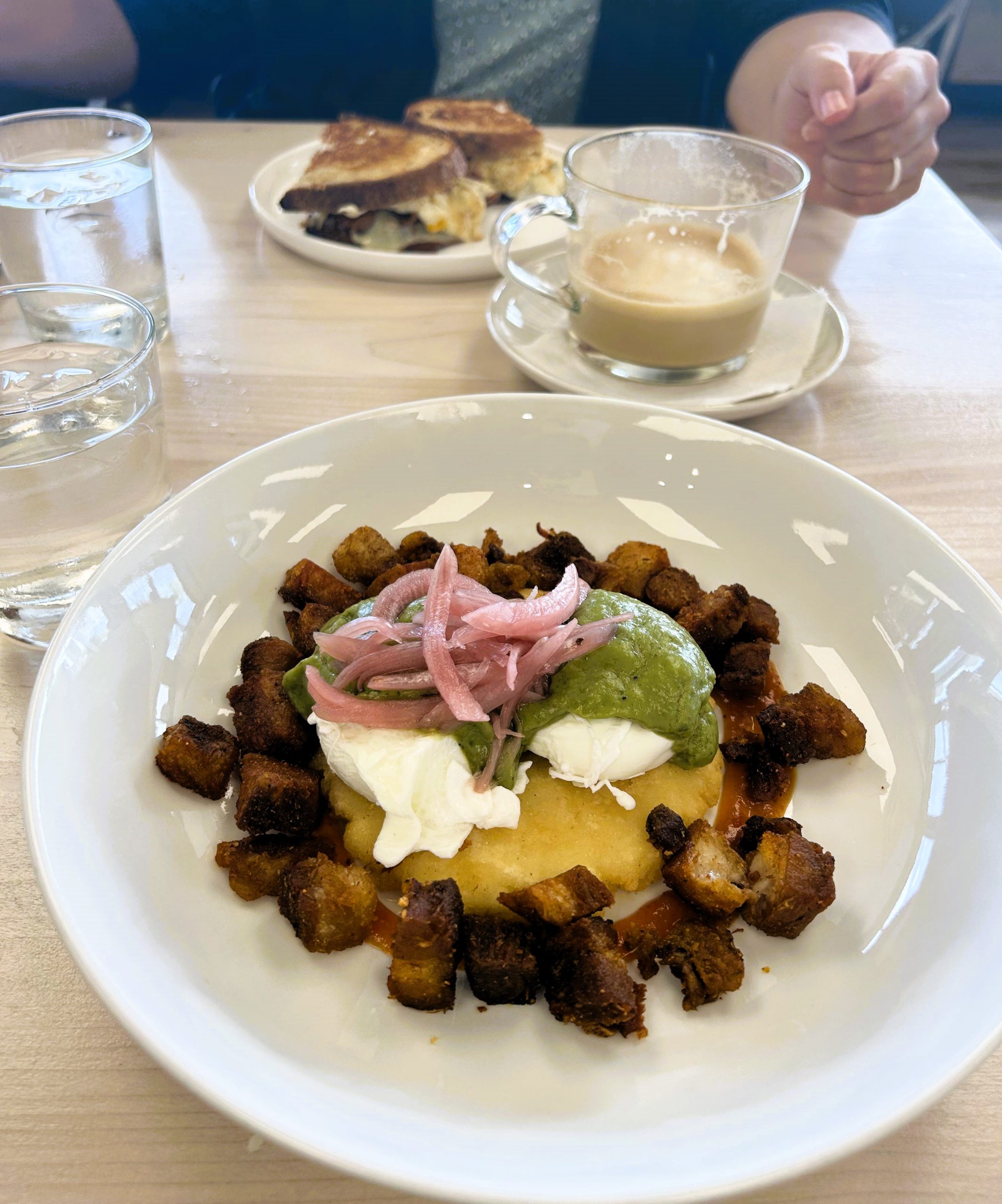 Breakfast is as delightful as lunch with an eclectic selection including steak and egg tacos, the aforementioned grilled eggs and cheese, fried banana bread (Crystal’s favourite!) and a wild take on eggs benny featuring corn pudding and a ring of carnitas fried into little hash brown-sized nuggets of deliciousness.
