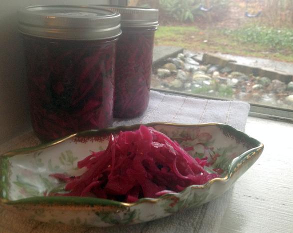 Pickled Red Cabbage (Makes enough to fill 3 large Mason jars, or 4 medium ones)