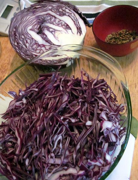 - Dump all the finely sliced cabbage into a big, non-reactive bowl and mix in the salt. Really get your fingers in there and make sure it’s evenly distributed. Cover with plastic wrap and let sit in the refrigerator overnight. When you remove the cabbage the next day it should have a slightly wilted look to it (the salt has broken down some of the fibres) and a vastly increased reddish colour. Coolness! Now give the cabbage a light rinse to remove excess salt and drain well.
