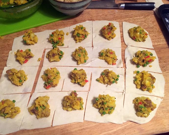 - Plop a line of the pumpkin/potato filling in rows 1 ½ inches apart onto the dough. Each lump of filling should be approx. 2 Tbls. and have an equal distribution of potato, pumpkin, peas, etc. Run a knife in straight grid lines between the lumps of filling.