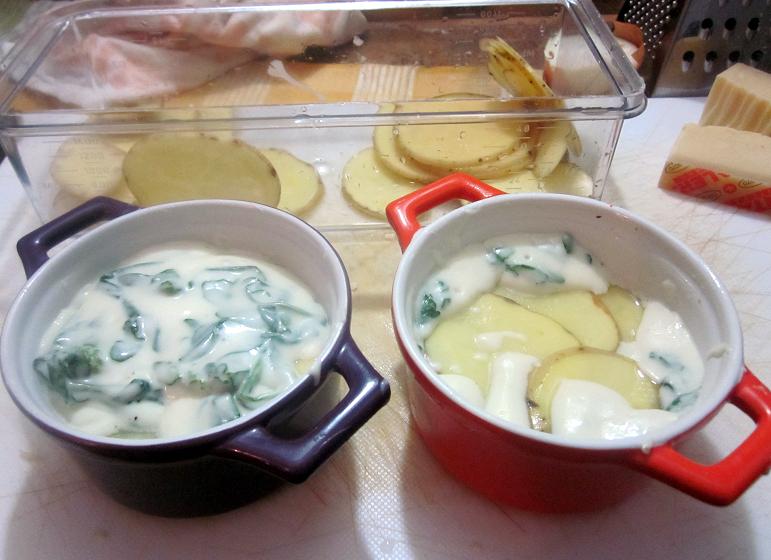 Butter the inside of a large oven-proof ramekin (or use smaller, individual portion ones. It’s the same method) and place a single, overlapping layer of the potatoes along the bottom. Dollop enough mornay sauce to completely cover the potatoes then layer a handful of the watercress over the sauce. Repeat until you’ve reached the top of the ramekin, top with more sauce and a handful of any remaining grated cheese. Fire it into a 375˚F oven and bake it for 45 minutes or until it’s soft inside and golden ‘n bubbly on top. Serve with roasted venison.