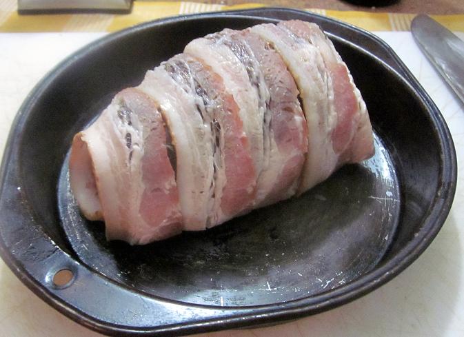 - Fire up a sauté pan over med-high heat. Pour the remaining 2 Tbls. of olive oil into the hot pan and swirl it to cover the edges. Sear the roast (2 minutes per side) until the whole thing is golden brown and retire it to a nearby cutting board. Don’t throw the pan into the sink! We’re going to need that later on! Wrap the roast in slightly overlapping rashers of bacon so that the entire surface is covered, place it in a lined roasting pan and fire it into a 375˚F oven for 30 minutes.