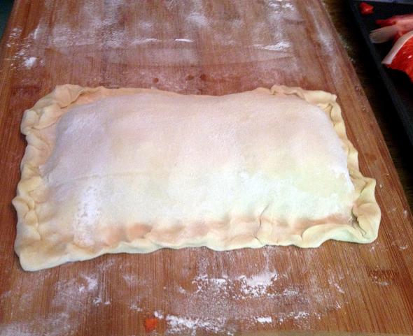 - Place the second piece of pastry over the salmon like a shroud and gently pull the edges of both sides until they meet. Pinch or roll the dough to seal them together all along the edge. Cut off any excess dough from the edges and make sure there are no tears that will let out the heat during cooking. Decorate your big pastry pocket with any excess dough, or cut patterns into the top that will darken and expand when heated. I went for the cartoon fish look and everyone thought it was pretty cute.