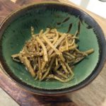 Dried shiitake mushrooms can be found practically anywhere now, but if you’re local Mega-lo-Mart doesn’t stock them, try a whole food or Asian foods market. Open the vacuum-sealed package and you’ll get that first breathe of deep mustiness that always seems to permeate Chinese medicine shops (shiitakes have long been considered symbols of longevity and have been used to promote healthy immune systems for centuries). They can be re-hydrated in hot water and gently simmered in a sweet broth of soy sauce, rice wine and rock sugar until they become tender and that already funky mushroom flavour concentrates into pure super funk. This process is called “Shoyuzuke” in Japanese, and translates roughly to “pickled in soy sauce”. When I do this at home, I usually brine them with a splash of rice vinegar to give them a bit of edge.