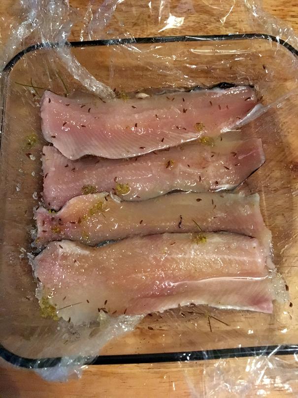 - Mix all the wet and dry ingredients together and rub all over the trout fillets. Wrap tightly in plastic wrap, place into a non-reactive container and refrigerate the trout in the marinade for six hours.