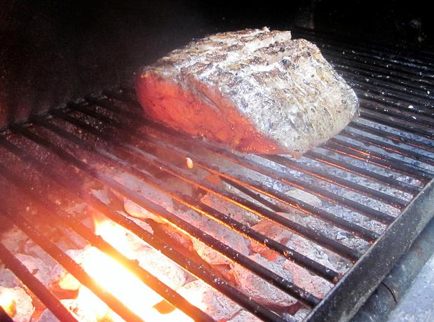 - Heat up the coals in your BBQ to ‘screamin hot and lay them in a single layer for medium, even cooking. Sear the pork, fat side down over the coals for four minutes, or until the surface of the fat is golden brown. Turn it over and repeat the process (4 minutes each) for each side of the loin.