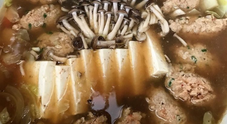 Take all the meat stripped off the drumsticks and soak them in 1 Tbls (15ml) each of Soy Sauce, Sake and Mirin. Pass the marinated meat through a grinder or chop finely by hand. Add a Tsp (5ml) of Sesame Oil along with a handfull of finely chopped Green Onions (12g) one Whole Egg and 1 Tbls (7g) of Cornstarch. Mix it all up and scoot the bowl over beside your simmering hot pot. Using two spoons, scoop up a wad of the chicken mixture and passing the mix back and forth between the two teaspoons create a small football-shaped quinelle. This will probably take a couple failed footballs before they start looking nice. Don’t stress, it’s all edible. Drop each little football into the simmering broth as quickly as you can. The meatballs should fill the un-occupied spaces in the broth