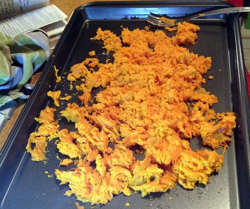 - Grab a cloth to protect your hands and get scoopin! Use either a spoon or fork and get all the flesh out of those spuds and plop ‘em into a ricer or potato mill. Squidge all that sweet potato through the finest little holes you can find (perforated steam pan instead of a ricer?) and lay it all out in a single layer on a baking pan to cool for about ten minutes.