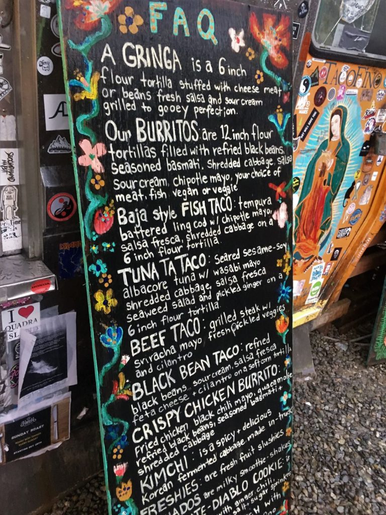 There we were, three ‘o clock in the middle of a torrential winter downpour and only just pulling into town. Dinner was supposed to be something fancy that I could cross off some list, take a gang of pictures and prove what erudite food enthusiasts we were but our tummies were empty since eight and not having it. We needed fuel pronto and the rocky Tofino parking lot looming on the right promised tacos.