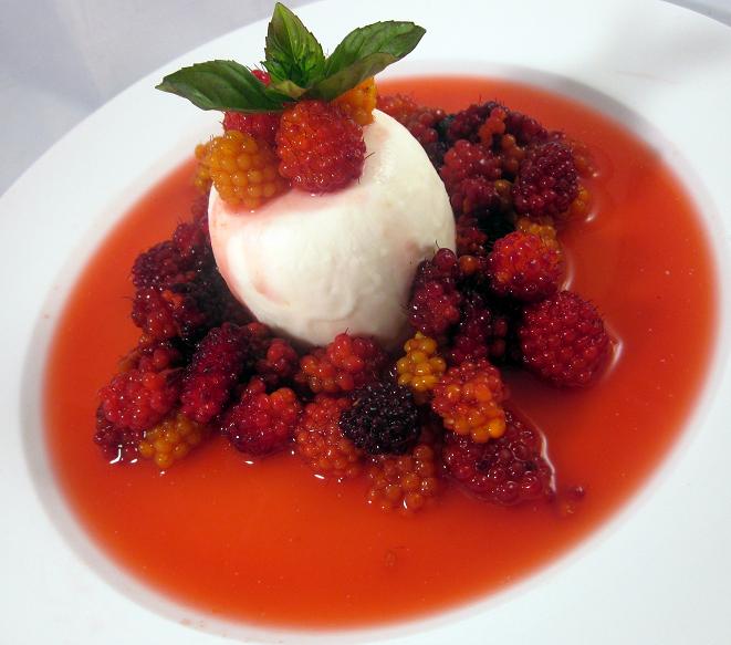 PannaCotta1We’re almost into our third week of June, and our Salmonberry bushes are still producing delicious edibles! But before I go out and brave the teddy bear’s picnic again, I’ve got a whole container full of berries in the fridge ready to cook with.