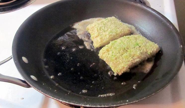 So yeah, voices in my head convinced me to take BC halibut, crust it in ground up wasabi peas and fry it… The results were majestic: