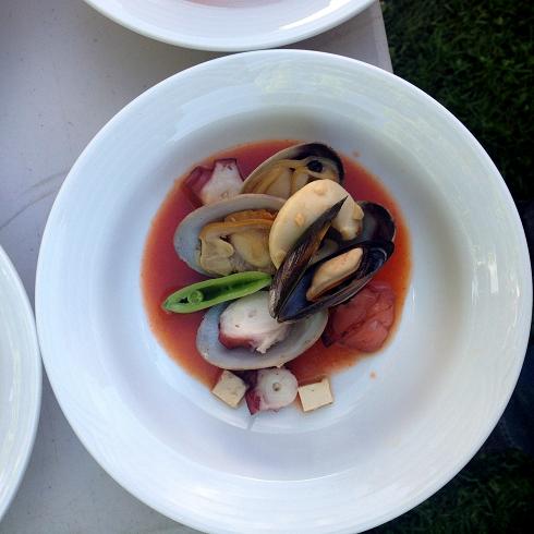 “It’s a bowl full ‘o cephalopods!” laughed the chef when asked what he had in store for the diners, “and get this… They’re cold!” This got a laugh and a couple of odd looks, but Peter Zambri wasn’t completely kidding around. His dish did indeed feature a mountain of lightly-steamed octopus, clams and scallops, but the cold tomato and fennel broth was no joke: somehow rich and light at the same time with a seriously refreshing finish. The dish was finished with scallions, chillies and a last minute hit of freshly grated horseradish then sent on its way. The rustic look and flavour of the dish was a perfect counterpoint to the refined and elaborate first course.