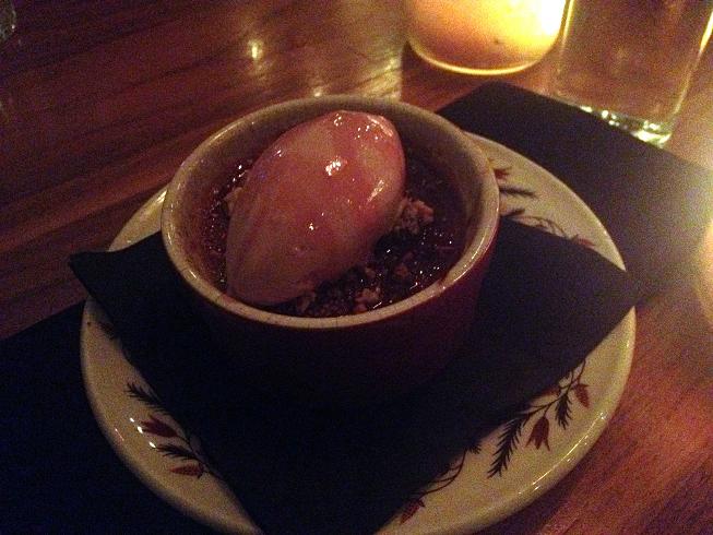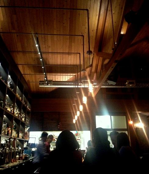 We sprawled on lush couches with mis-matched pillows drinking Cava and delicious cocktails out of mis-matched glassware. The warm, wood interior, birch bark lighting fixtures, driftwood art and antique dinnerware all gave the dining room an inviting feel akin to a neighborhood coffee shop. But the sleek industrial bar design and bronze heat lamps at the kitchen pass let us know that this joint meant sexy business.