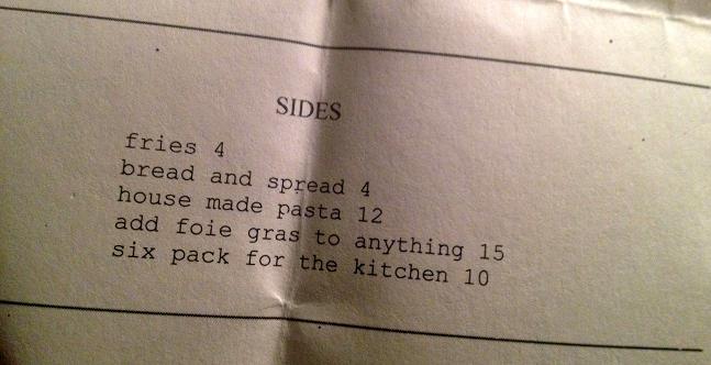 This was it; the hype (at least for me!) was all about the menu and what that translated into on my plate. It was just one sheet tacked to an unassuming clipboard. A handful of appys and mains and a little group of platters to share amongst two people… I (and we, because Crystal and I have had so many of these adventures together that we are indivisible, plus I include Sean andJen in this statement) have never, ever had so much trouble deciding what to order for dinner. Everything begged to be eaten.